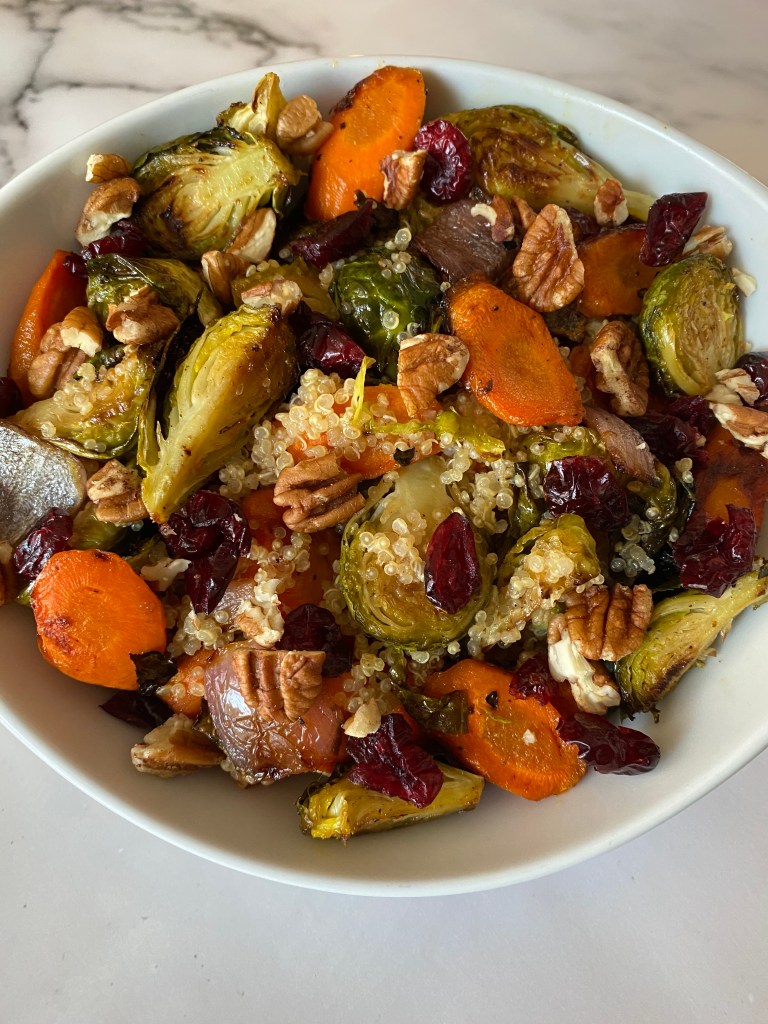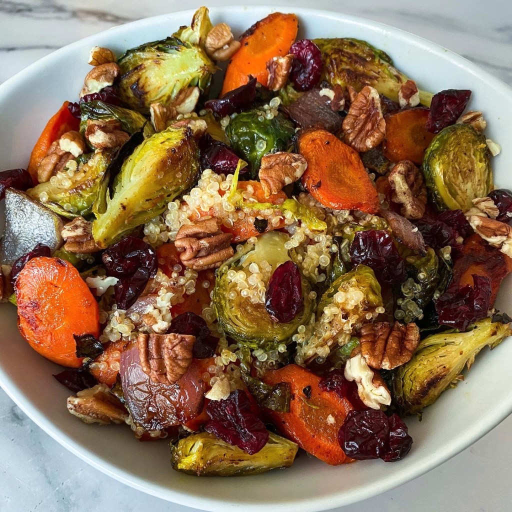 8. Mix together roasted vegetables, quinoa, dried cranberries, and pecans.