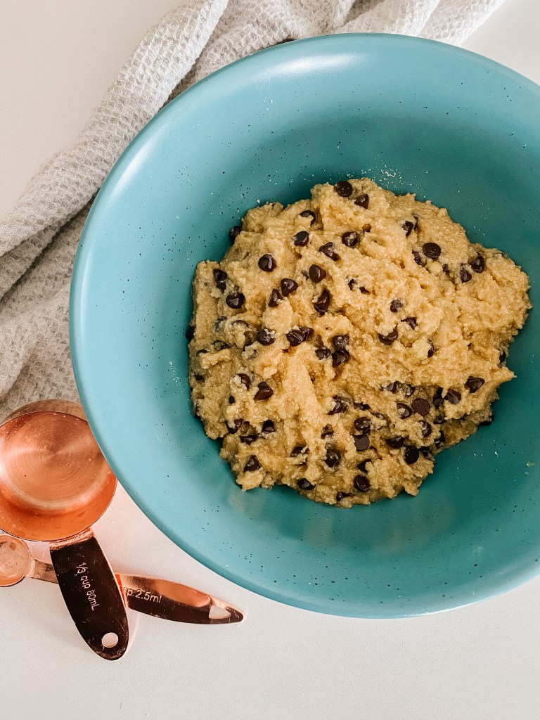 4. Add dry ingredients to wet and mix to combine. Fold in chocolate chips.